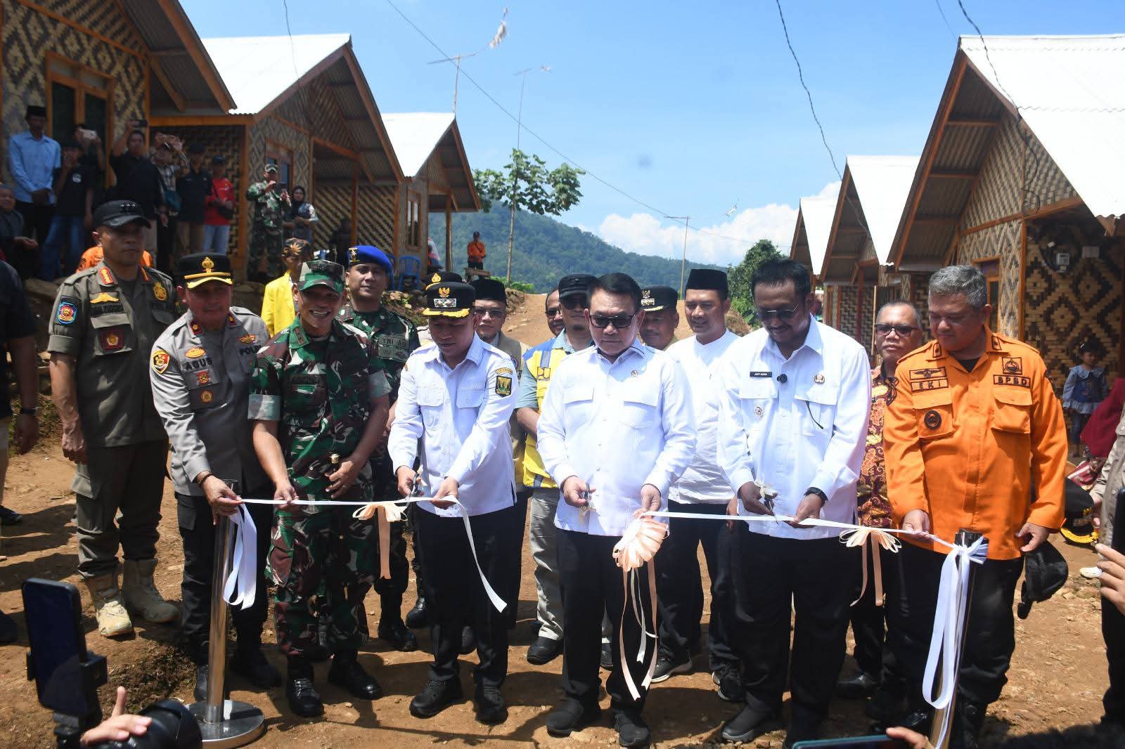 http://Catatannews.id ][ Sukabumi ][ Bupati Sukabumi H Asep Japar bersama Wakil Bupati H Andreas mendampingi kunjungan kerja Penasihat Khusus Presiden Bidang Pertahanan Nasional, Jenderal TNI (Purn.) Prof. Dr. H. Dudung Abdurachman dalam peresmian hunian tetap (huntap) adaptif bencana di Desa Sukarame, Kecamatan Cisolok, Kabupaten Sukabumi, Kamis (16/4/2026).