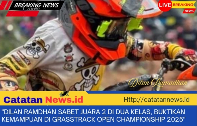 http://Catatannews.id ][ Bogor ][ Dentuman mesin dan sorak sorai ribuan penonton menggema di Sirkuit Citilam 124, Jasinga, Kabupaten Bogor, pada ajang Grasstrack Open Championship 2025 yang digelar Sabtu–Minggu (6–7 Desember 2025). Di tengah ketatnya persaingan para rider profesional dan remaja, muncul sosok kecil berusia 7 tahun yang menjadi kejutan terbesar dalam gelaran tersebut. Ia adalah M. Dilan Ramdhan, atau yang akrab disapa Dion Bengal, bocah asal Desa Cipelang, Kecamatan Cijeruk, Kabupaten Bogor, yang sukses menyabet Juara 2 di dua kelas sekaligus.