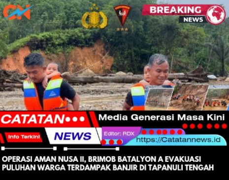 http://Catatannews.id ][ Tapanuli Tengah ][ Personel Batalyon A Satuan Brimob Polda Sumatera Utara bergerak cepat melakukan evakuasi warga yang terdampak banjir di Kelurahan Hutanabolon Lorong IV, Kecamatan Tukka, Kabupaten Tapanuli Tengah, Jumat (2/1/2026). Kegiatan ini merupakan bagian dari pelaksanaan Operasi Aman Nusa II Wilayah Sibolga dan Tapanuli Tengah dalam rangka penanggulangan bencana alam.