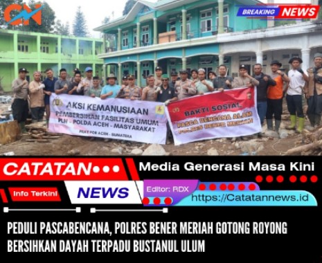 http://Catatannews.id ][ Redelong ][ Kepedulian terhadap masyarakat terdampak banjir dan longsor terus ditunjukkan oleh Polres Bener Meriah. Pada Sabtu (27/12/2025), personel Polres Bener Meriah turun langsung ke Dayah Terpadu Bustanul Ulum yang berada di Desa Gelampang Wih Tenan Uken, Kecamatan Permata, untuk melaksanakan kegiatan bakti sosial bersama warga setempat.