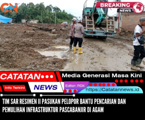 http://Catatannews.id ][ Agam ][ Dalam rangka pelaksanaan tugas BKO Polda Sumatera Barat, Tim SAR Resimen II Pasukan Pelopor melaksanakan kegiatan pencarian lanjutan terhadap korban bencana banjir yang masih hilang di Desa Kayu Pasak Selatan, Kecamatan Palambayan, Kabupaten Agam, Minggu (28/12/2025).